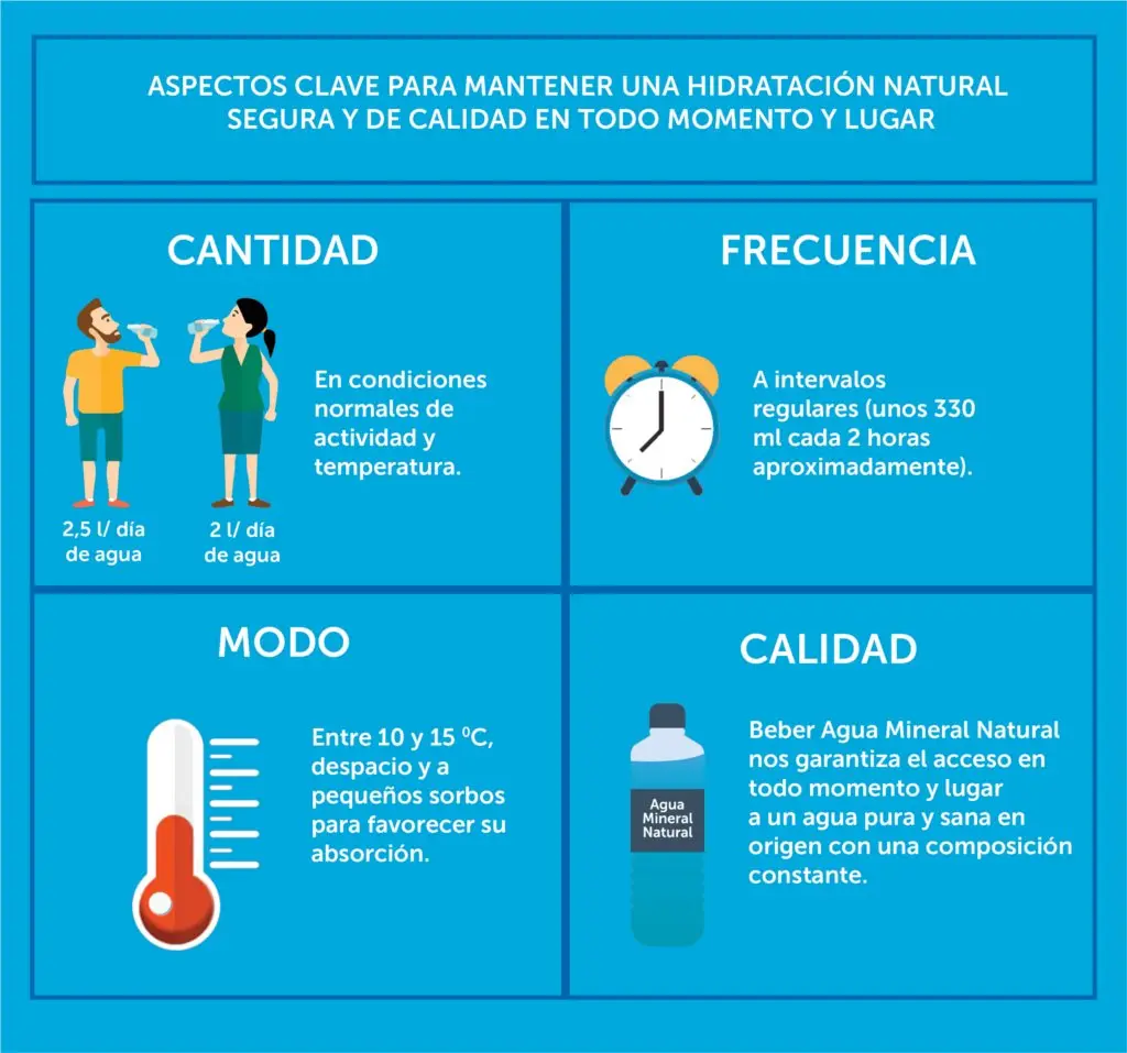 El 70 % de la composición de nuestro cuerpo es agua. Es un elemento indispensable para mantenerlo sano porque, además de limpiar el organismo y eliminar las toxinas, es un eficaz vehículo para transportar las vitaminas y sales minerales que necesitan nuestras células.